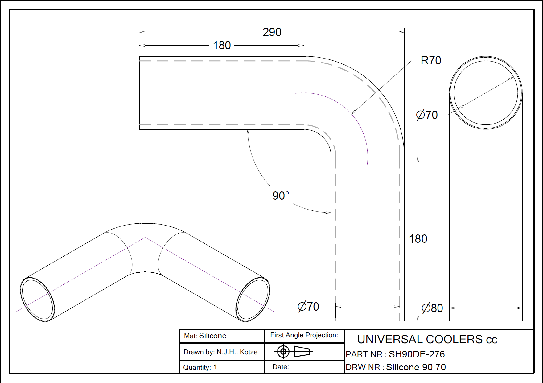 90° Bend 70 mm ID, 200 mm legs (SH90DE-276)